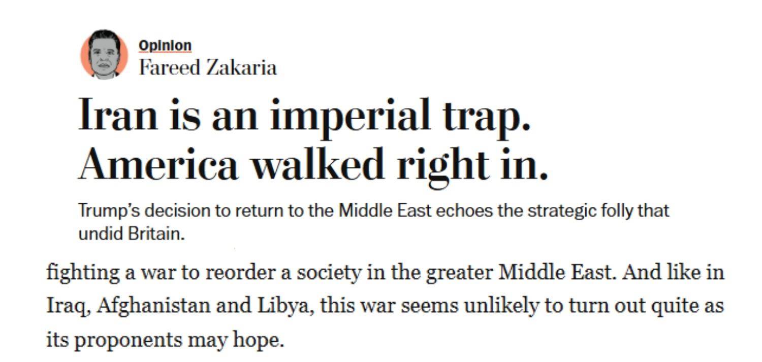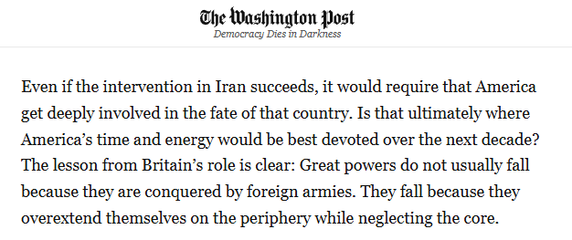 文章最后說,即便對伊朗的干預取得成功,美國也將不得不被捆綁于該國的命運走向。但這難道真是未來十年美國最值得傾注時間與精力的方向嗎?從英國的興衰中得出的教訓清晰可見:超級大國的隕落,通常并非源于外敵的征服,而是因為自身在邊緣地帶過度擴張,卻忽視了核心所在。