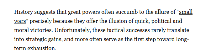 文章認為,歷史表明,大國往往難以抵御"小型戰爭"的誘惑,正是因為這些戰爭給人以迅速取得政治和道義勝利的錯覺。然而,這些戰術上的勝利很少能轉化為戰略上的收益,反而往往成為國力長期消耗的開端。