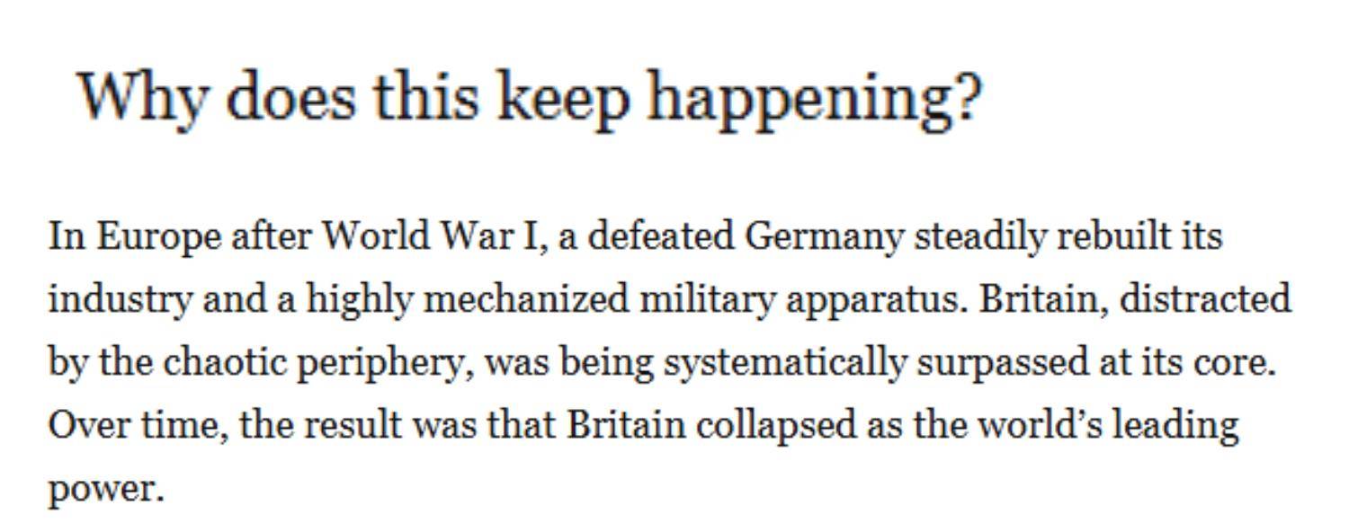 為什么這種情況一再發生?文章認為,要了解當下,就必須回望歷史。英國曾是世界唯一的超級大國。而當英國領導人就美索不達米亞的戰略激烈辯論時,他們卻從根本上忽視了自身面臨的經濟問題和技術挑戰。就在英國與中東和非洲部落作戰之際,大西洋彼岸的美國正在悄然打造當時全球最先進的工業經濟體系;第一次世界大戰后的歐洲,戰敗的德國穩步重建工業和高度機械化的軍事體系。而因動蕩的邊緣地帶分心的英國,其核心實力正被系統性超越。最終,英國失去了世界霸主的地位。
